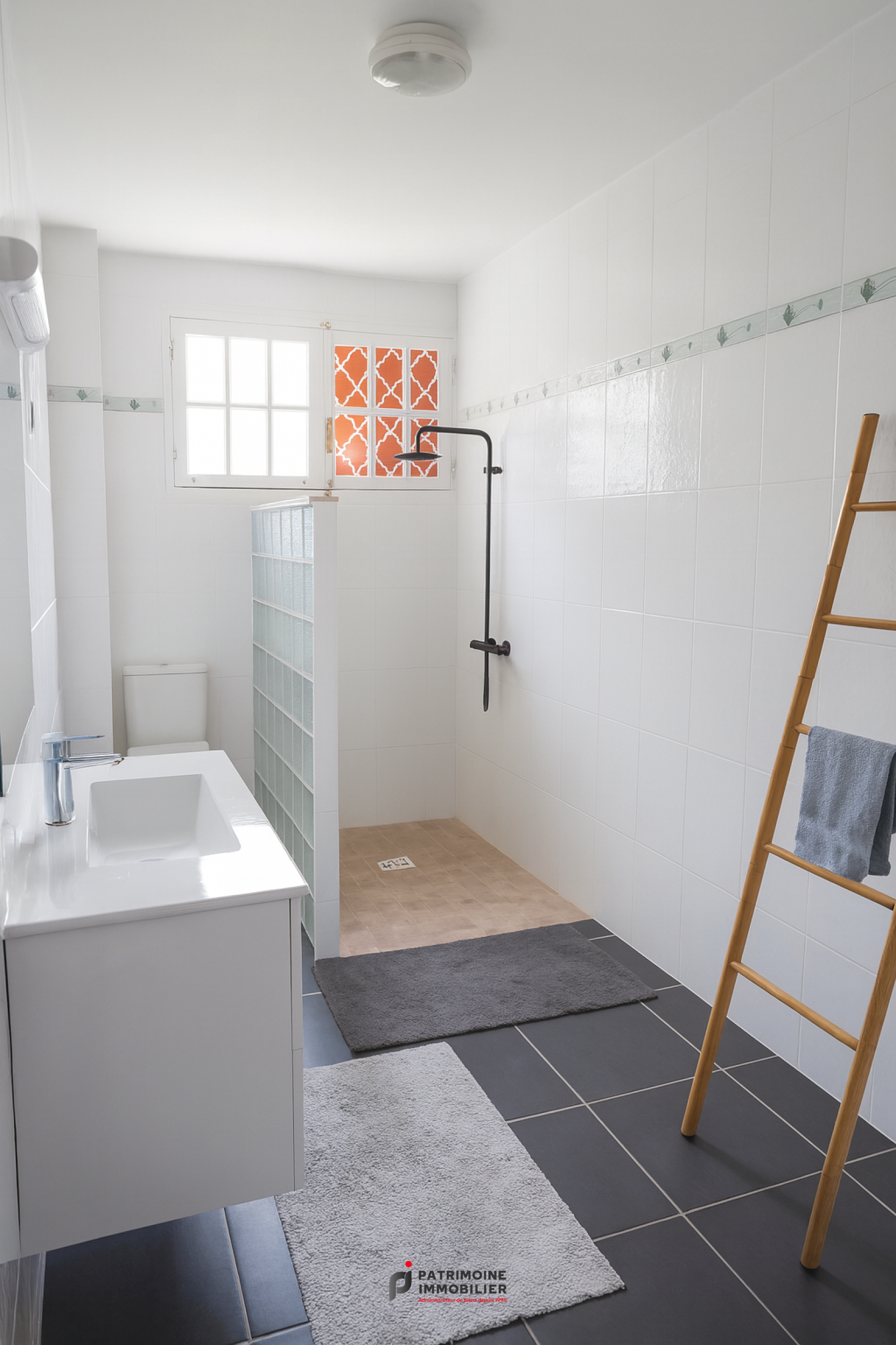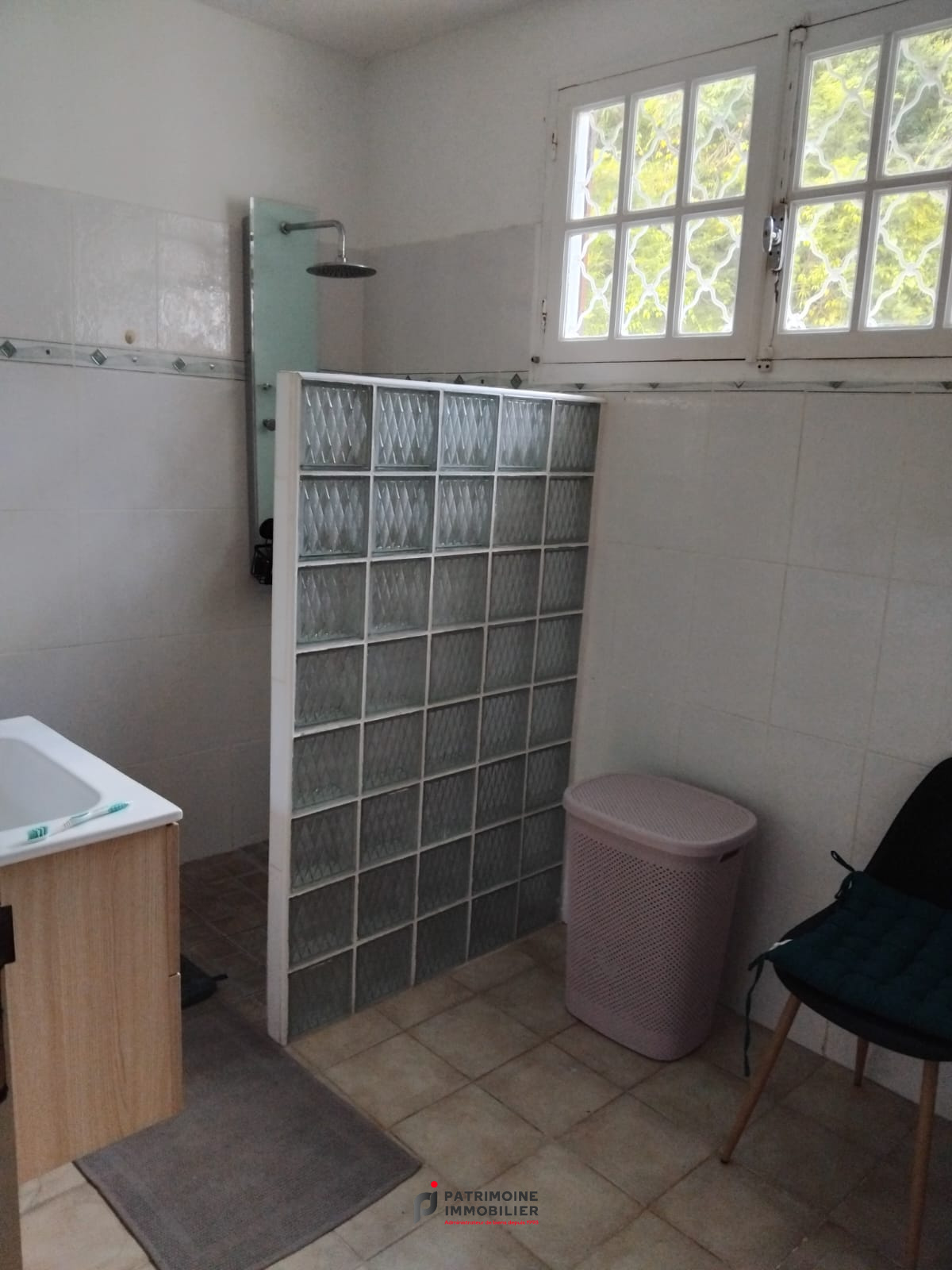 Une villa de 5 pièces : salon, quatre chambres dont une avec salle d'eau et WC, un bureau, une salle d'eau, un WC, loggias, terrasse.